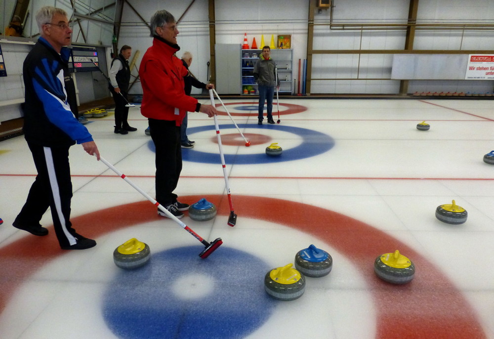 Schön ist, dass die “Blitz-Curlingschule“ nie für die Füchse ist, denn jedes Mal gibt es einige Mitmachende, die noch nie dabei gewesen sind. Dazu kommt, dass bei jährlich nur einmaligem Spielen das meiste wieder verlernt ist und also eine Auffrischung (Refresher auf Neudeutsch) nur gut tun kann. Wir Spieler haben uns natürlich daheim vorbereitet: Jeder hat ziemlich sicher kürzer oder länger am TV unseren Curling-Golddamen zugeschaut, wie man es macht, um Weltmeister zu werden. Mit diesem mentalen Hintergrund kann nichts schiefgehen.