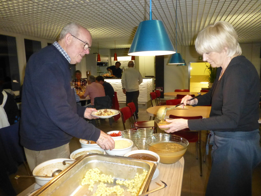 Nach den ersten vier End geben wir Paul den Punktestand bekannt, nach den zweiten vier End nochmals. Nun hat er die Unterlagen, um die Rangliste zu erstellen. Wir begeben uns wieder an die Wärme im Restaurant, wo nach kurzer Zeit Salat serviert wird und wir uns anschliessend am Pennetopf und am Saucentopf bedienen dürfen. Die Küchencrew hat einmal mehr vorzüglich gearbeitet.