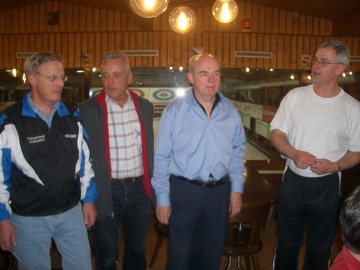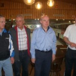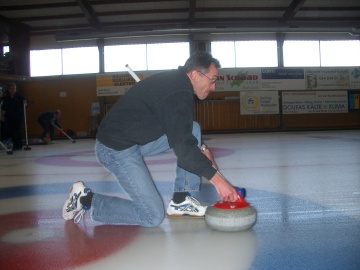 Genug der Theorie, nun wollen wir spielen. Paul Keller hat die Gruppenzusammenstellung schon zu Hause aufgrund der Anmeldungen vorgenommen. Nun kann er sie einfach mitteilen, und jeder weiss, zu wem er gehört und auf welcher Bahn er spielt. Da ich kein intensives, dreijähriges Training vorweisen kann, gelingen die Steine oft nicht wie gewünscht. Auch Koni hat noch nicht Olympiareife erlangt. Nur Walti Baumgartner scheint der Sache schon deutlich näher zu kommen.