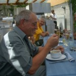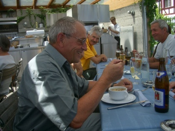 Zur vorgegebenen Zeit erreichen wir das wunderschön gelegene Restaurant. Die tolle Aussicht reicht über den ganzen Zürichsee bis in die Alpen. Wir treffen hier noch weitere Kameraden mit Partnerinnen. Essen und trinken unter diesen Umständen sind wirklich eine Freude. Turi bestellt sich sogar einen Dessert, unterlegt mit einem seiner träfen Sprüche: “Ich habe zwar keinen Hunger mehr, aber eine kolossale Fresslust“.
