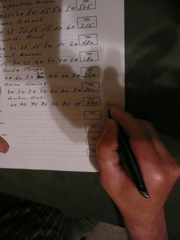 Nun gehts los: Hier ein Kranz, dort ein Nuller, hier ein Babeli, dort ein Einer, verdrehte Augen nach Bandenkontakt, das grosse Strahlen nach einer perfekten Abgabe mit entsprechendem Resultat, Applaus bei den Zuschauern oder Gelächter nach einer eher humoristischen Einlage, kurz, die Stimmung ist bestens und der Unterhaltungsfaktor gross. Nicht nur gekegelt wird, sondern auch gejasst – oder besser gezockt. Die Beträge, um die es geht, sind allerdings extrem viel bescheidener als im Bankenwesen. Felix ist beschäftigt in seinem selbst aufgebauten Verarbeitungs- und Pressezentrum.
