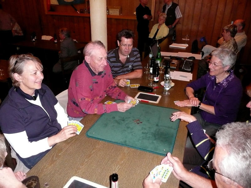 Halbzeit ist Essenszeit; wir bewegen uns Richtung Restaurant. Dort ist alles bereit für uns, und der Wirt weiss sich mit lauter Stimme durchzusetzen, um die Bestellungen für die Getränke aufnehmen zu können. Essen und Stimmung sind auch hier sehr gut. Aber wir raffen uns trotzdem wieder auf zum zweiten Teil unseres heutigen Abendsportes.