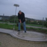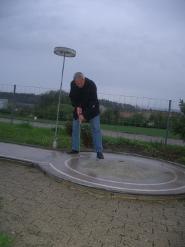Mit einiger Verspätung treffen wir am Ort des Geschehens ein. Wir begrüssen die kleine Gruppe der Nichtspieler und schauen uns um. Es ist beruhigend zu erkennen, dass das Grillfeuer schon brennt. Die Gruppe der Wetterfesten ist schon bei Loch 15, die fallende Feuchtigkeit wird etwas intensiver. Trotzdem entschliesse ich mich, den Parcours in Angriff zu nehmen, nicht ohne vorher noch einen Blick leichten Unverständnisses von meiner Frau zu empfangen, was also heisst, dass ich als Einzelgänger loslege. Doch schon an der dritten Bahn kommt Klaus, um mir Gesellschaft zu leisten. Er hat seinen Einsatz bereits beendet und findet zu Recht, dass es mehr Spass macht zu zweit.