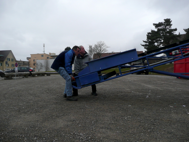Das Transportband funktioniert tadellos, die ersten Lieferwagen kommen schon vor Beginn der offiziellen Sammlung mit voller Ladebrücke an (aus geheimen Tiefen, der Schreibende verrät nichts – niemand kommt zu Schaden). Erich und Nico verteilen die Sicherheitswesten, anschliessend gibt Erich die Fahrer bekannt. Sobald ein Name genannt wird, melden sich spontan die nötigen Helferinnen und Helfer, damit eine Sammelmannschaft komplett ist. Noch schnell das Revier in Form eines Kartenausschnitts fassen, und los geht’s.