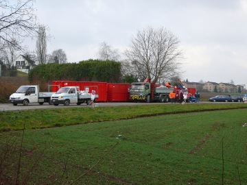 Neu ist dieses Mal, dass der Abladeplatz nicht mehr beim Bahnhof ist und nicht mehr SBB-Güterwagen das Papier aufnehmen. Vier grosse Container warten auf uns in der Nähe des Spöde, und das neue Konzept muss sich bei uns zuerst einmal einspielen. Es ist etwas komplizierter geworden, und Platz zum Manövrieren ist weniger vorhanden. Aber da unser Geist beweglich ist und unser Fahrkönnen einen hohen Standard hat, können wir alle anfallenden Probleme innert nützlicher Frist lösen.