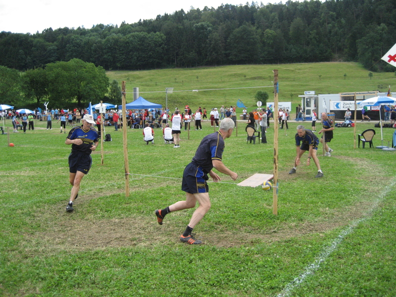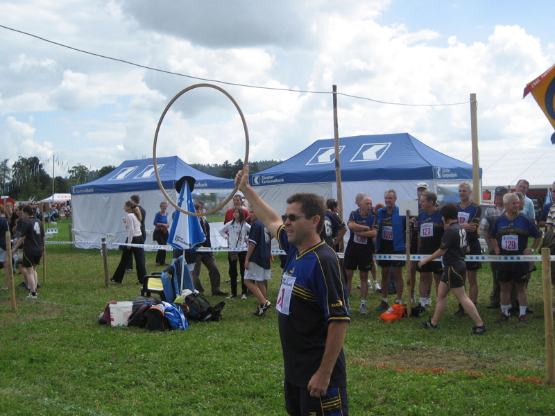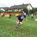 Nach letzten Stärkungen und einem lockeren Einlaufen standen wir dann am Start zum Rugbyball durch den Reifen, die einzige Disziplin, die die Riege als Gesamtheit (also nicht in Gruppen aufgeteilt) zu absolvieren hatte. Und siehe da, der Auftakt gelang nach Mass, nur wenige Bälle fanden nicht den anvisierten Weg durch den Reifen und in die griffbereiten Hände! Leider ging es dann nicht so erfolgreich weiter, der Tennisball beim Goba-Baseball war scheinbar vielen zu klein zum Fangen und zu schwer zum Schlagen – trotz teilweise akrobatischen Einlagen wurden hier viele Punkte verschenkt. Anschliessend stand dann die vom Bewegungsablauf her schwierigste Aufgabe auf dem Programm: Beachball übers Kreuz. Vor allem die erste Gruppe à 6 Mann bot eine hervorragende Leistung, das Stimmungsbarometer schnellte wieder in die Höhe! Auch die beiden weiteren Teams lieferten im Rahmen ihrer Möglichkeiten gute „Arbeit“ ab – das richtige Ballgefühl, gepaart mit Schnelligkeit und Konzentration, ist halt nicht jedermann gegeben.
