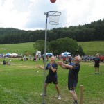 Nach einer kurzen Verschnaufpause ging es dann um 13.00 Uhr weiter mit Ballprellen über die Leine. Dies gelang den meisten eigentlich recht gut, Aussetzer gab es keine – also voller Hoffnung weiter zur nächsten Disziplin Korbball. Wenn man super drauf ist und vielleicht auch etwas grösser geraten ist, kann man hier gut punkten. Das Glück spielt hier, gepaart natürlich mit Konzentration und Technik, auch eine grosse Rolle – so mancher Ball „küsste“ den Korbrand und machte sich dann ausserhalb aus dem Staub! Summa summarum fanden einfach zu wenige Bälle den richtigen Weg – also wieder einen Dämpfer!
