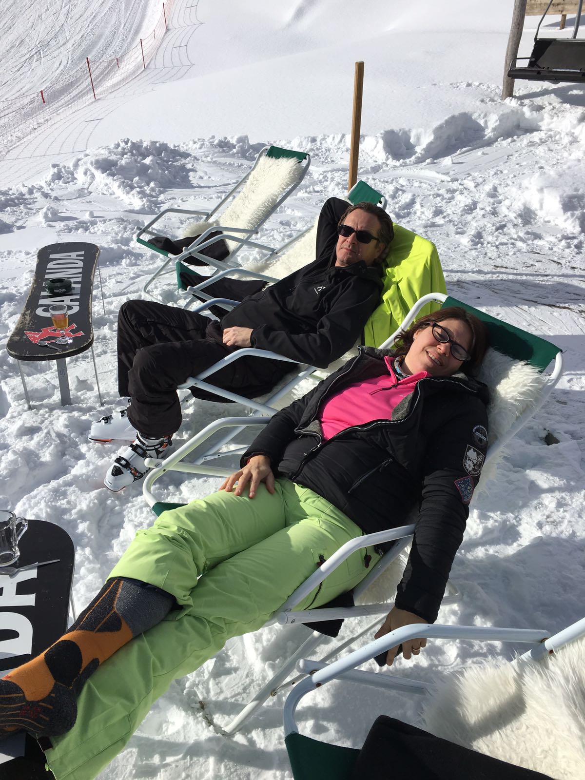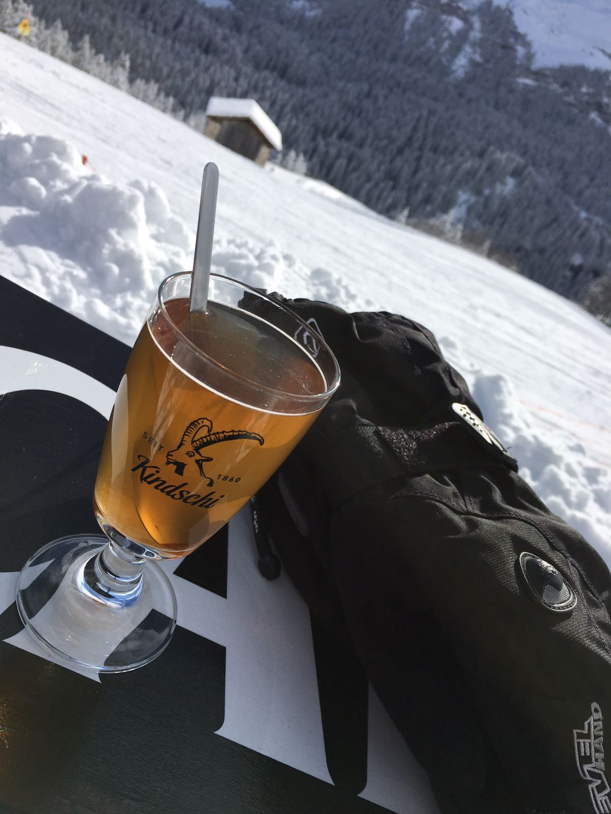 Bei Waschmaschinen-Shots, Churer Stadtbier und Fressbecher verfliegt die Zeit im Nu und schon ist es Zeit, die letzte Bahn ins Tal nicht zu verpassen. Pe, Phüdli, Chipo und ich machen aber mit den Ski noch einen kurzen Abstecher ins Ganni, bevor wir vor anbrechender Dunkelheit endlich die Abfahrt ins Tal antreten. Frisch geduscht geniessen wir anschliessend im Restaurant daPapà italienisches Essen zusammen mit Sonja und Maria.